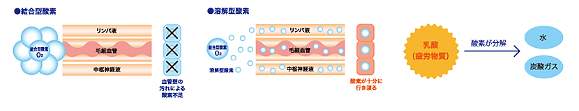 運動をすると筋肉などに蓄えられた糖分(グリコーゲン)は、エネルギーを生み出すと同時に、いわゆる疲労物質と言われる「乳酸」を作ります。 人間の疲労感は、この乳酸の蓄積によるものといわれています。 酸素はこの乳酸を炭酸ガスと水とに分解してくれます。