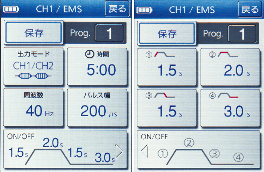 ・EMSモードは、「ランプアップ/ホールドタイム/ランプダウン/オフタイム」機能により、通電・休止時間を個別に設定が可能。